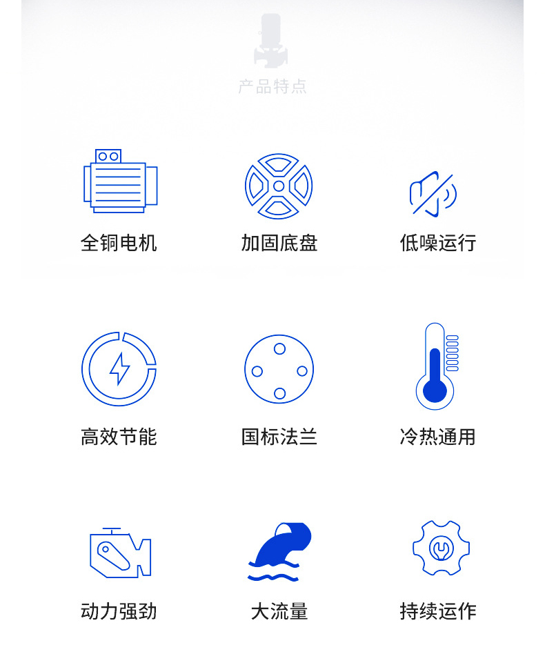 產品說明:南方泵業td單級立式管道循環泵,泵進出水口在泵底同一直線上,產品設計為頂部可拉出的拆裝形式,其可以在不影響管路系統的情況下對泵進行維修。