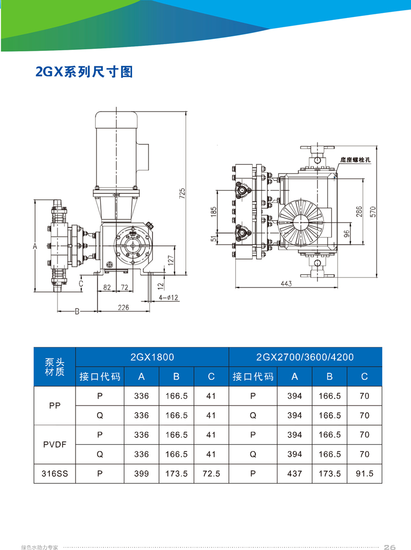 2、機械驅動隔膜,物料側無隔膜護盤,便于物料通過,PP、PVDF、316SS等多種泵頭材質可選,自清洗單向閥結構。