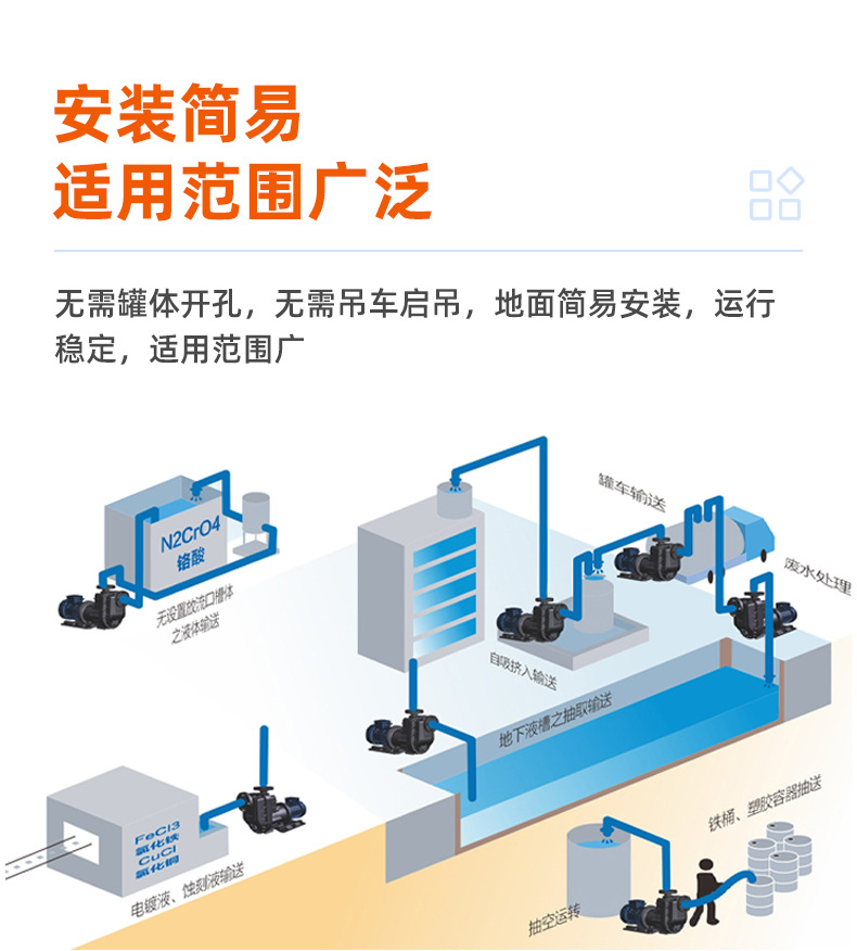 電鍍、化工、農(nóng)藥、任何強(qiáng)腐蝕性液體的輸送、石油、酸洗