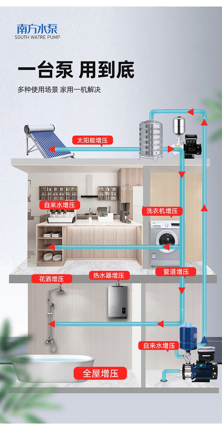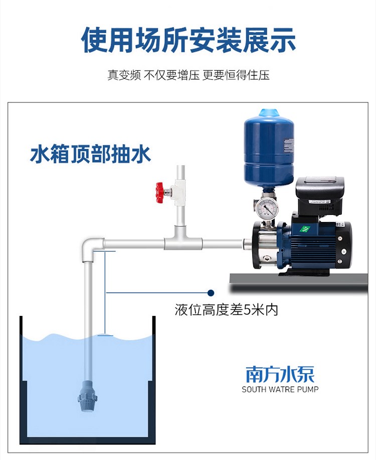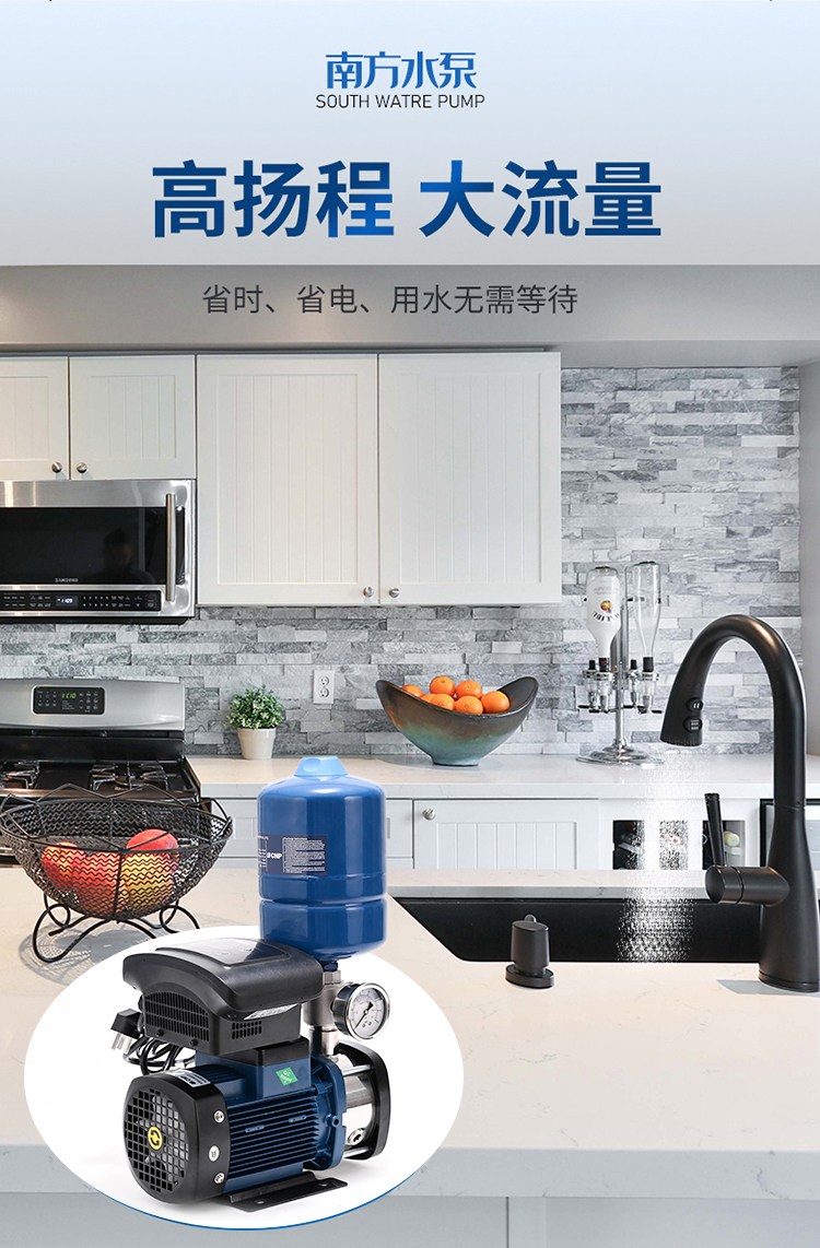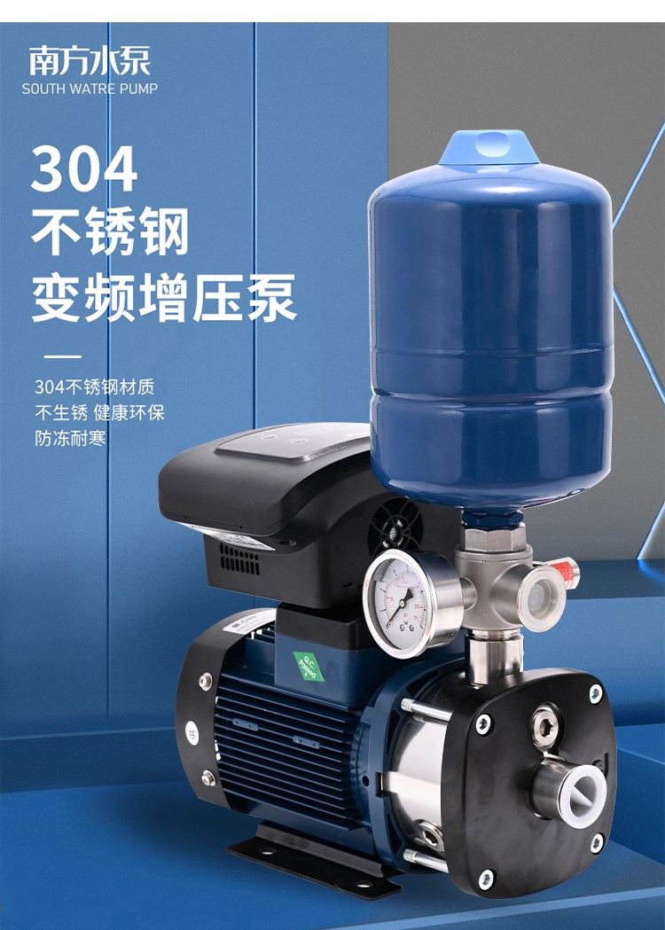 南方CHME系列臥式智能恒壓變頻泵采用了變頻調(diào)速及自動化控制相結(jié)合的技術(shù),配合高效節(jié)能的CHM非自吸輕型臥式多級離心泵。整機主要由CHM泵、控制器、傳感器、壓力罐、五通止回閥及軸向抗震壓力表等組成。具有性能穩(wěn)定、高效節(jié)能、全自動智能控制、低噪音、耐腐蝕、結(jié)構(gòu)緊湊、外形美觀、體積小、重量輕等特點。