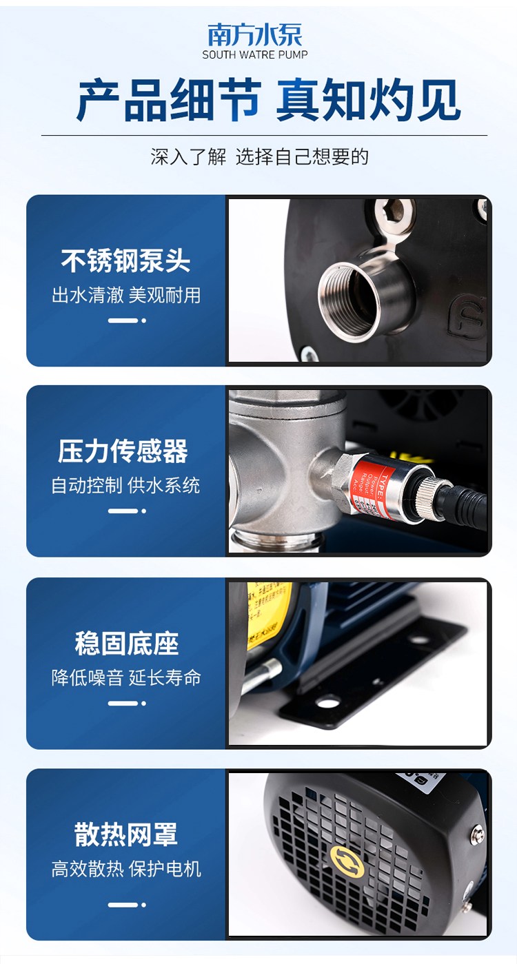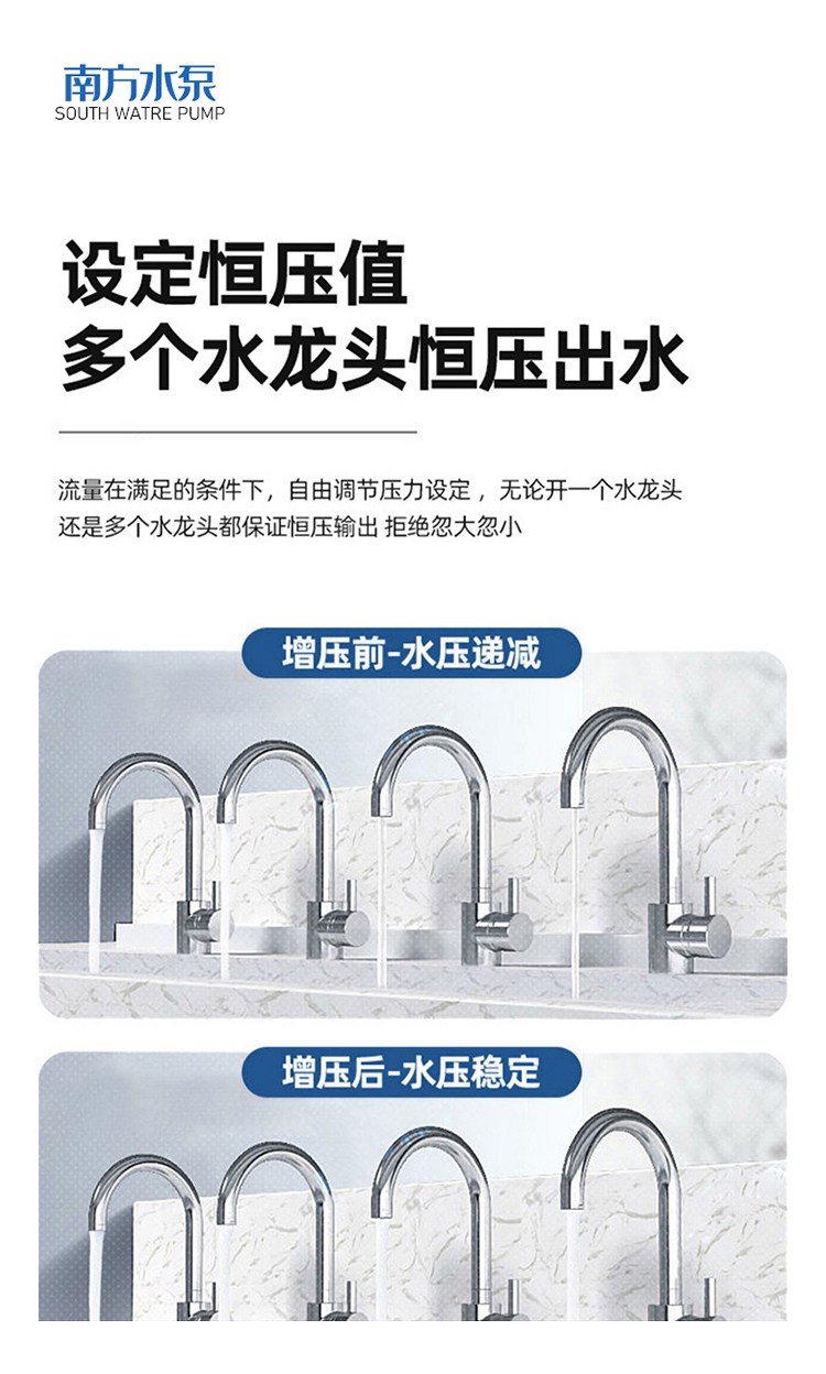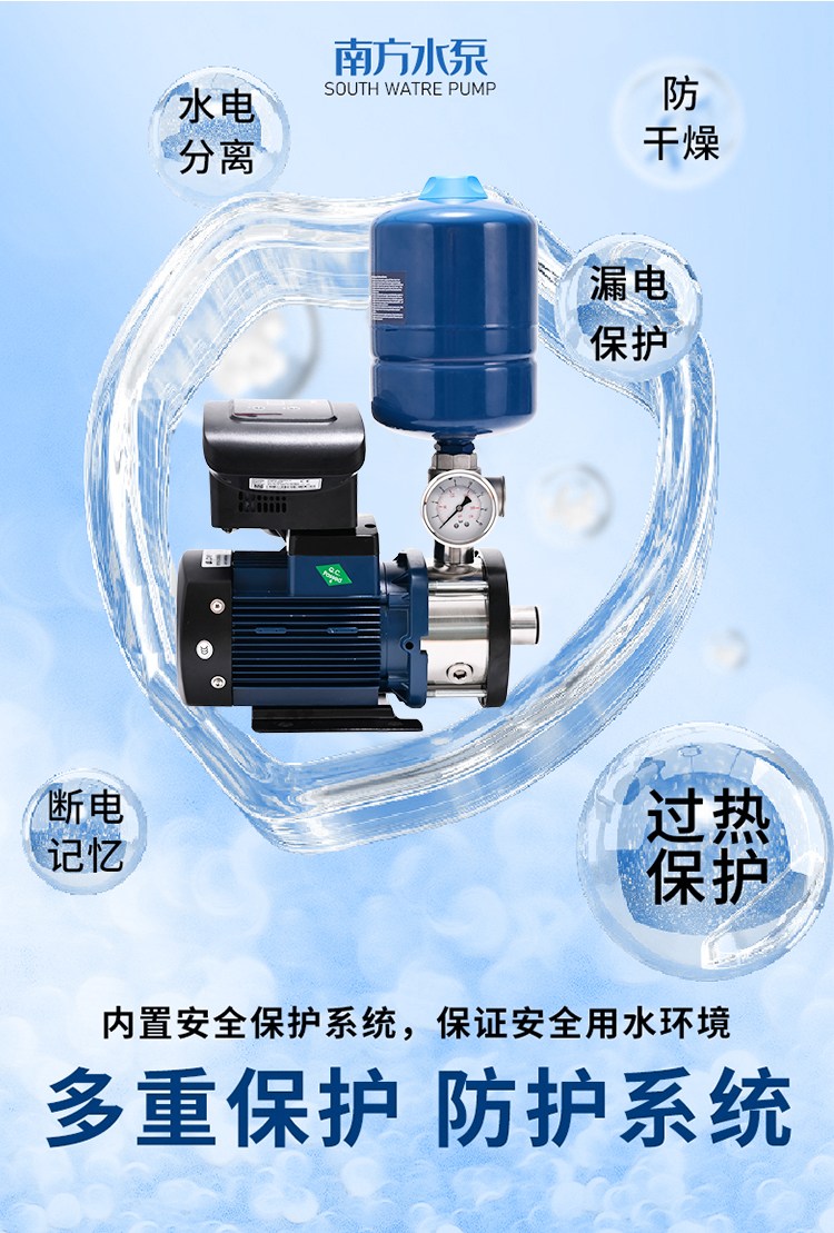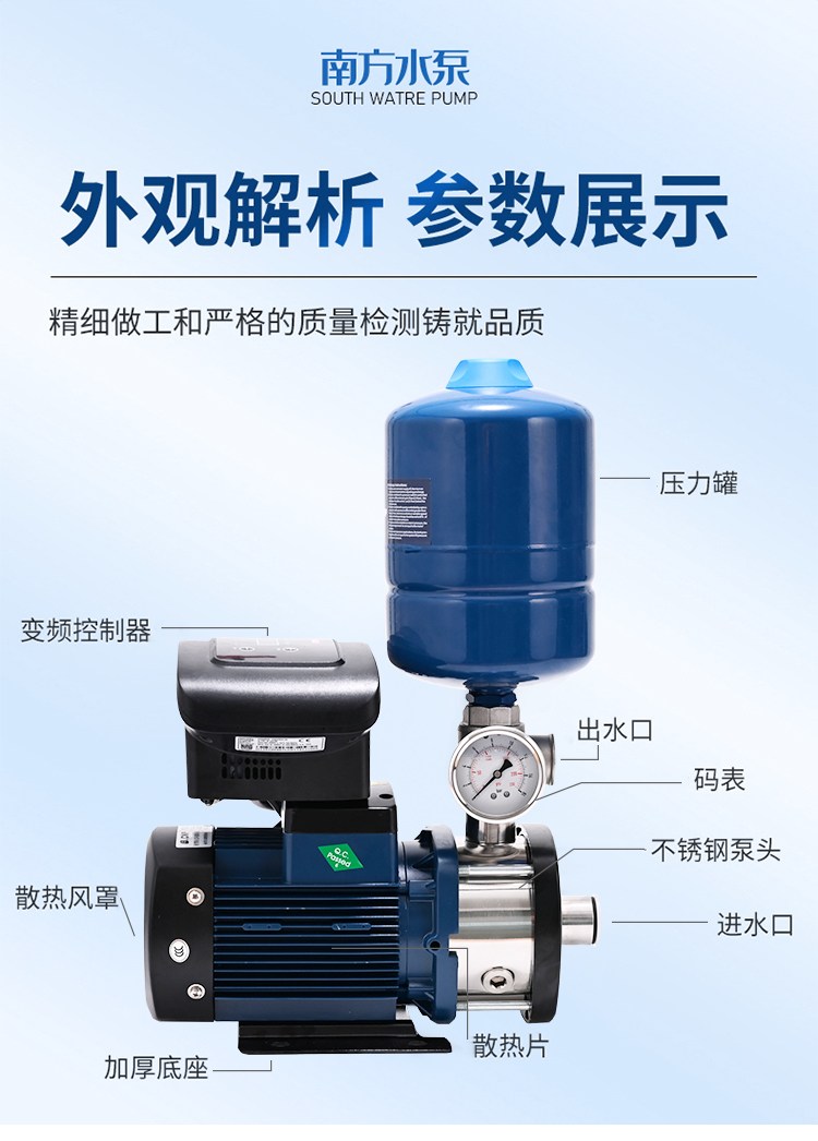 南方CHME系列臥式智能恒壓變頻泵采用了變頻調(diào)速及自動化控制相結(jié)合的技術(shù),配合高效節(jié)能的CHM非自吸輕型臥式多級離心泵。整機主要由CHM泵、控制器、傳感器、壓力罐、五通止回閥及軸向抗震壓力表等組成。具有性能穩(wěn)定、高效節(jié)能、全自動智能控制、低噪音、耐腐蝕、結(jié)構(gòu)緊湊、外形美觀、體積小、重量輕等特點。